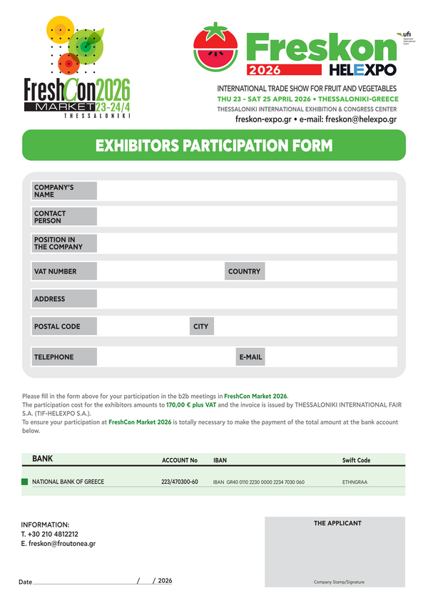 To participate in B2B meetings, interested exhibitors must register by completing and send the form below at the email address freskon@froutonea.gr